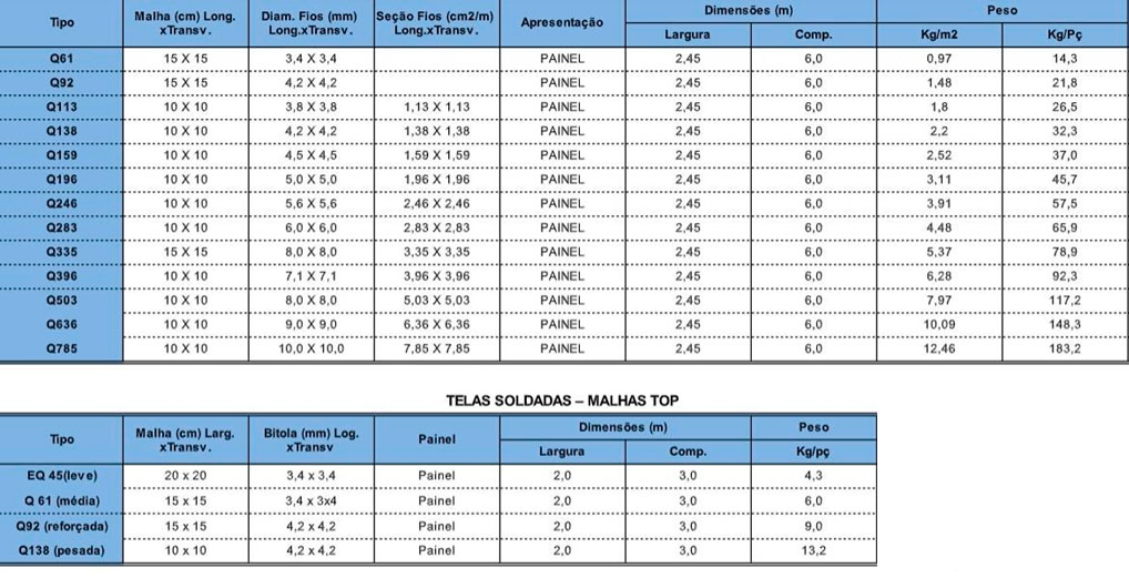 As telas soldadas de aço são armaduras pré-fabricadas constituídas por fios de aço CA-60 nervurado, longitudinais e transversais, de alta resistência mecânica, sobreposto e soldados entre si em todos os pontos de cruzamento (nós) por correntes elétricas (caldeamento), formando malhas quadradas ou retangulares. Os fios utilizados na fabricação das telas soldadas são obtidos por laminação a frio, a partir fio – máquina.